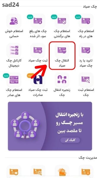 برای انتقال چک صیاد با برنامه ساد24 باید پس از نصب برنامه، خدمت انتقال چک را انتخاب کنید.
